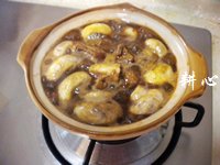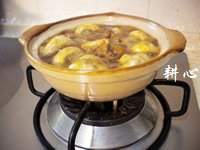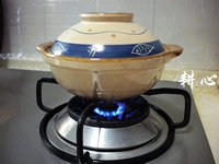 砂锅洗净,放入姜片和蒜头爆香,再倒入适量的粟米油。