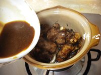 揭盖,倒入芡汁(芡汁就是利用腌制肋排碗里的酱汁,加点清水即可变成芡汁啦)。